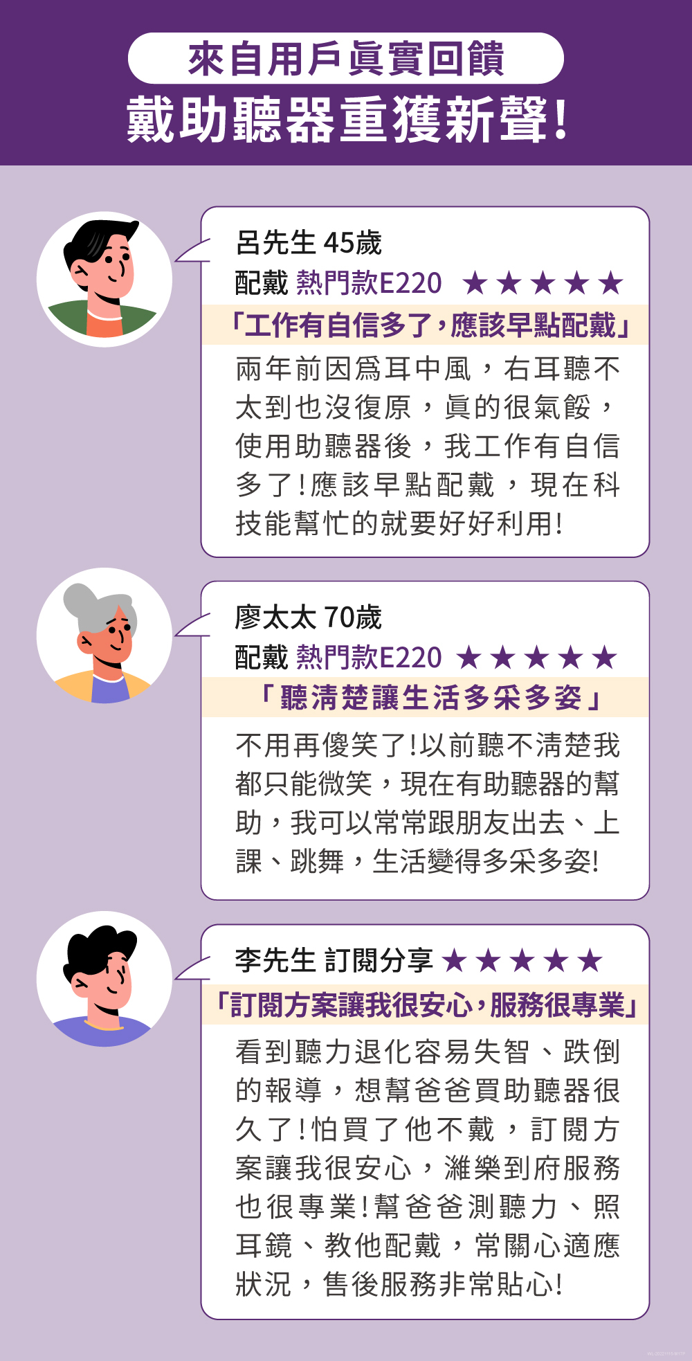 濰樂擁有多年助聽器服務經驗,我們時常遇到客戶考量價格、擔心買了不適應等原因,不願嘗試而延誤了配戴黃金時機!也減少社交、與家人聊天的機會,亦或購買較低價無降噪與保護聽力功能的擴音器,最後還是不舒服而不配戴,這都是非常可惜的!同時也增加了失智與跌倒等生活風險。因此,我們推出了超安心優質的訂閱方案,讓客戶能輕鬆享有高科技助聽器,讓聽清楚的生活更精采美好!