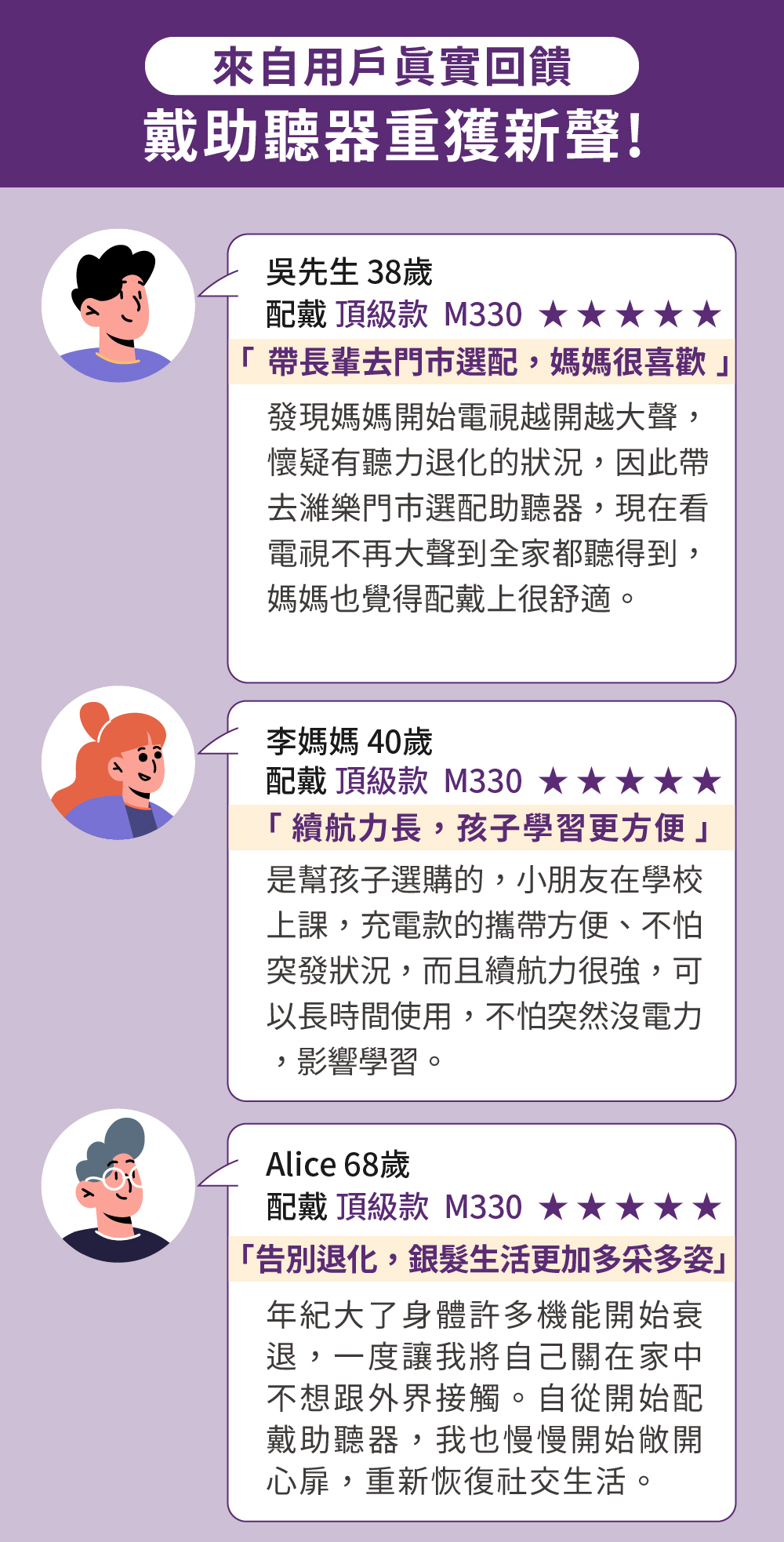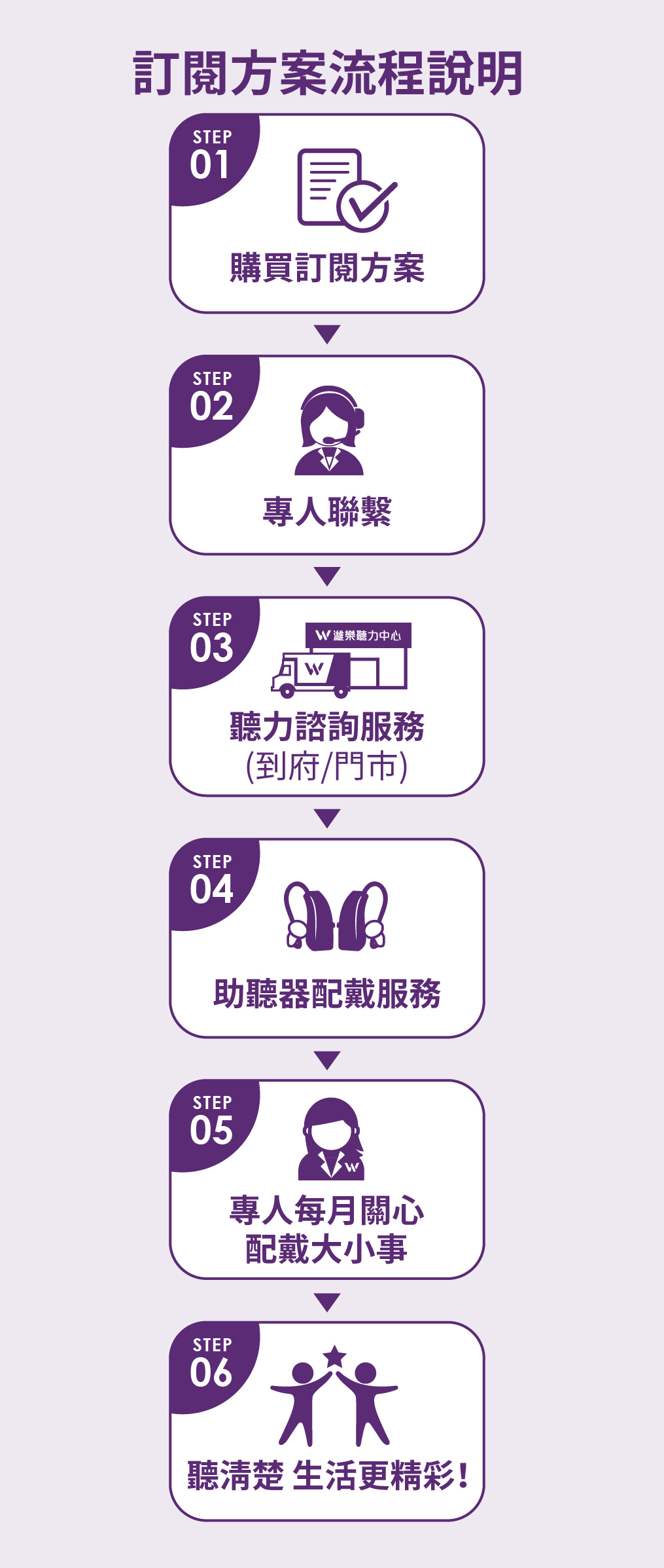 濰樂擁有多年助聽器服務經驗,我們時常遇到客戶考量價格、擔心買了不適應等原因,不願嘗試而延誤了配戴黃金時機!也減少社交、與家人聊天的機會,亦或購買較低價無降噪與保護聽力功能的擴音器,最後還是不舒服而不配戴,這都是非常可惜的!同時也增加了失智與跌倒等生活風險。因此,我們推出了超安心優質的訂閱方案,讓客戶能輕鬆享有高科技助聽器,讓聽清楚的生活更精采美好!